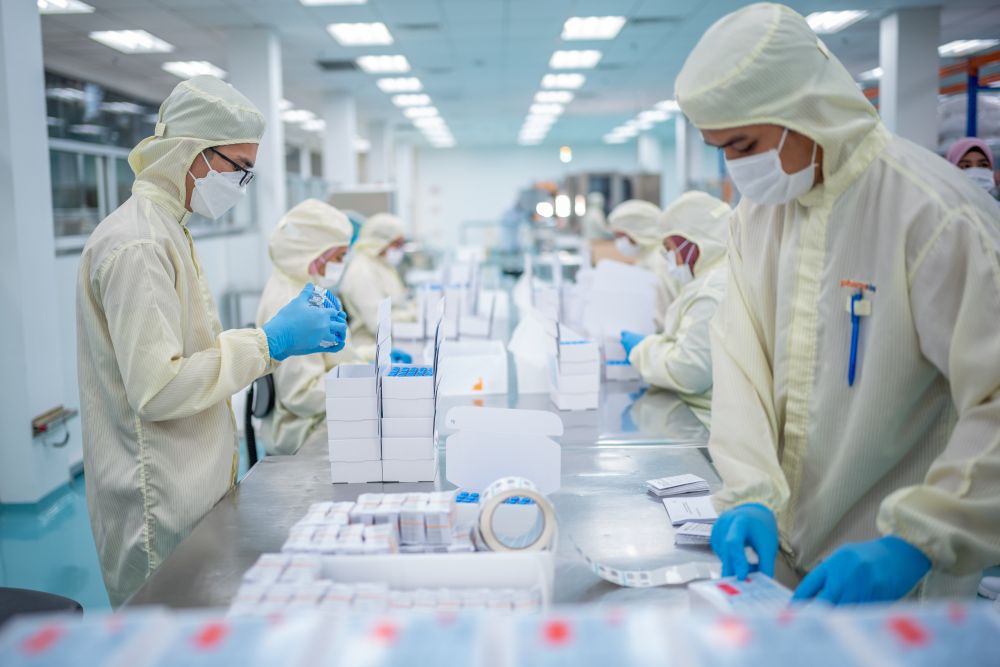 ↑2021年10月5日,在馬來西亞吉隆坡郊區的發馬公司灌裝工廠,工人在包裝本地灌裝生產的科興疫苗。本地灌裝中國疫苗已成為馬來西亞的驕傲。