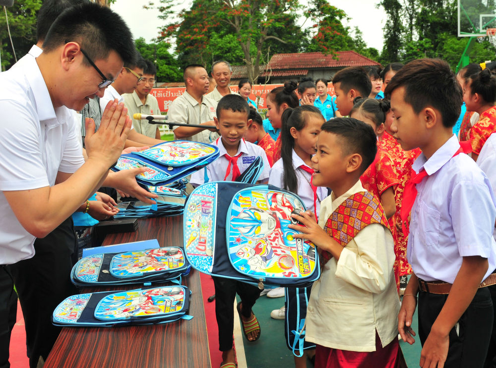 ↑2019年6月1日,在老撾萬象,中老友好農冰村小學學生接過中老鐵路中國工作人員贈送的文具禮物。