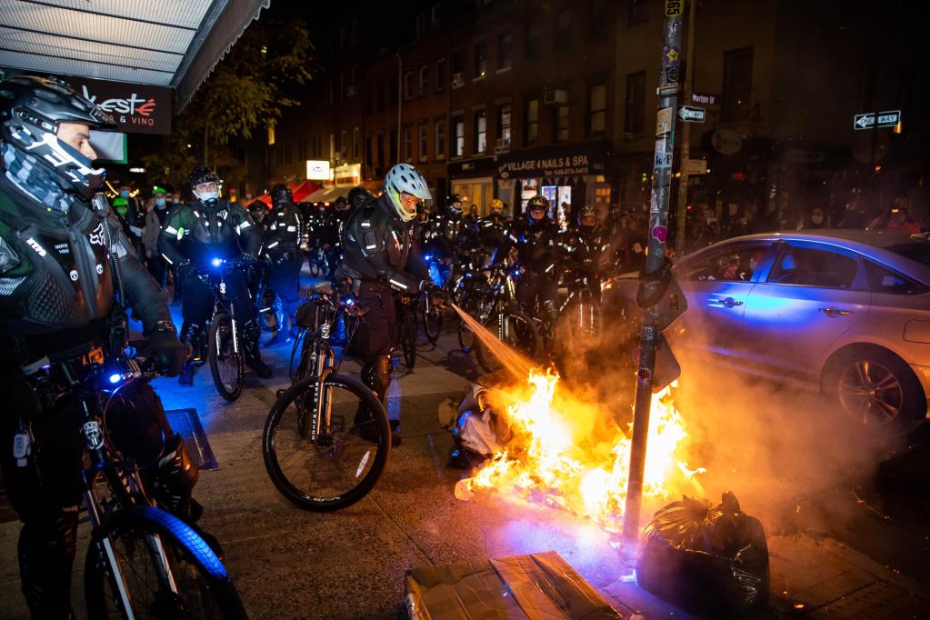2020年11月4日,在美國紐約,警察撲滅抗議者點燃的垃圾。(新華社發(fā),郭克攝)