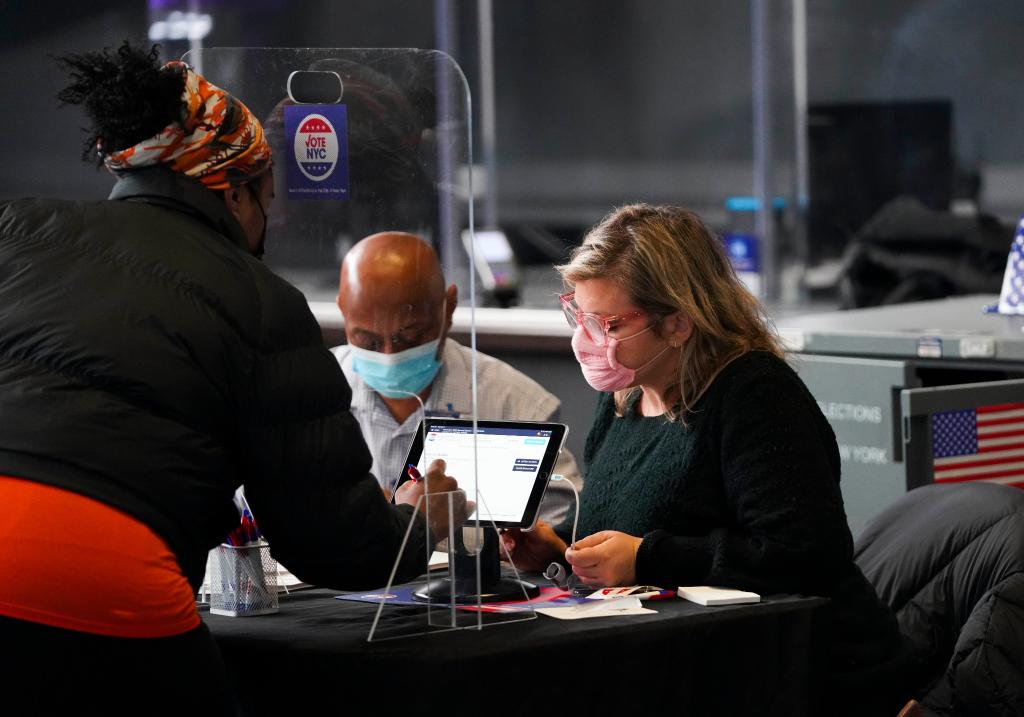 2020年11月3日,在美國紐約巴克萊中心的投票站,工作人員為選民辦理登記手續(xù)。(新華社記者王迎攝)