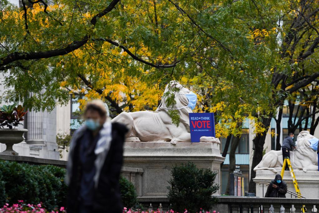 2020年11月2日,行人經(jīng)過美國紐約公立圖書館外鼓勵投票的廣告。(新華社記者王迎攝)