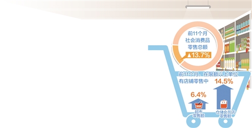 今年11月份的消費(fèi)數(shù)據(jù)顯示,超市等實(shí)體零售業(yè)態(tài)增速加快。國(guó)家統(tǒng)計(jì)局貿(mào)易外經(jīng)司統(tǒng)計(jì)師付加奇表示,前11個(gè)月,在限額以上單位有店鋪零售中,超市、倉(cāng)儲(chǔ)會(huì)員店零售額同比分別增長(zhǎng)6.4%和14.5%,增速分別比前10個(gè)月加快0.4個(gè)和1個(gè)百分點(diǎn);便利店零售額增速與前10個(gè)月份持平,仍保持兩位數(shù)較快增長(zhǎng)。