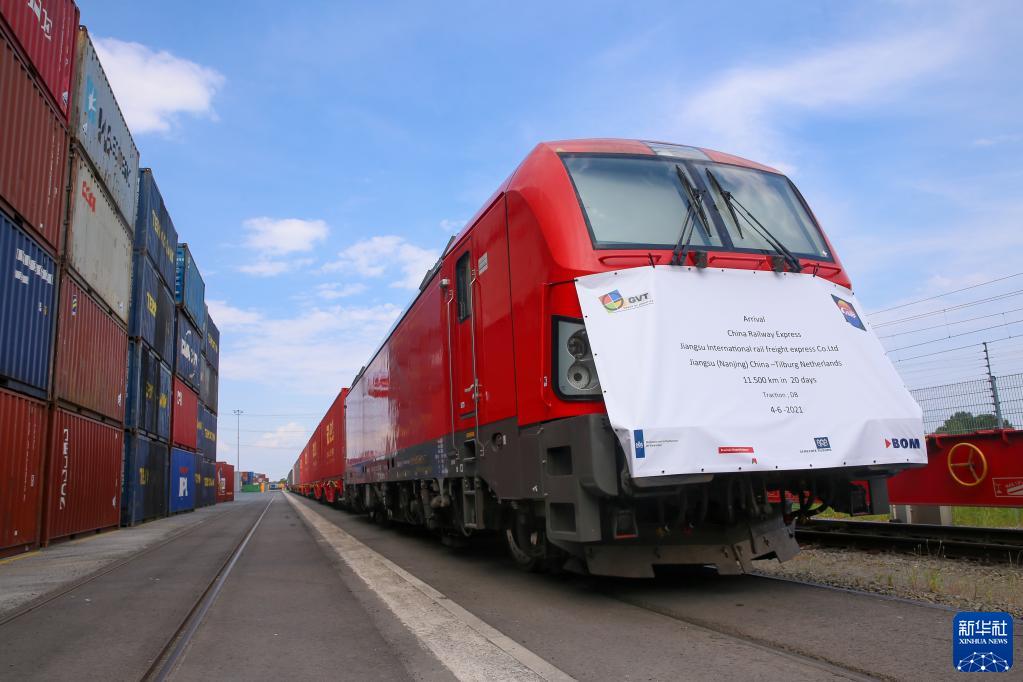 這是2021年6月4日,首趟從中國江蘇南京至荷蘭蒂爾堡的中歐班列抵達荷蘭蒂爾堡。新華社記者 鄭煥松 攝