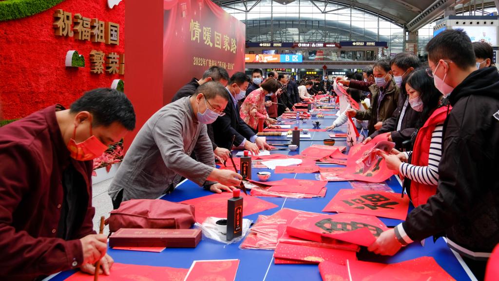 出發(fā)站的溫馨。17日上午,在廣州南站3樓候車大廳中央,十幾位來自廣鐵集團文聯(lián)和書法協(xié)會的書法家、畫家的“攤位”前面,擠滿了求取春聯(lián)、福字和畫作的旅客,6歲的李和拿著一張“虎年虎畫”在父母身邊喜笑顏開。春運首日免費為旅客寫春聯(lián)送福字,已成為廣州南站的“傳統(tǒng)”,一幅幅喜慶的春聯(lián)透露出一股濃濃的節(jié)日溫馨氣氛。