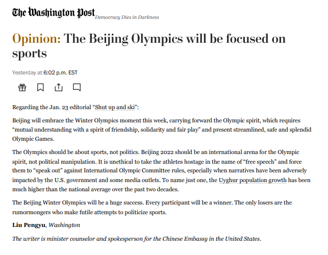這封信是對《華盛頓郵報》1月22日社論“中國向冬奧會運動員傳遞的信息:噤聲然后滑雪”的回應。