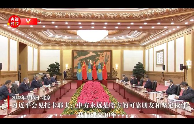 國家主席習近平2月5日上午在人民大會堂會見來華出席北京2022年冬奧會開幕式的哈薩克斯坦總統托卡耶夫。