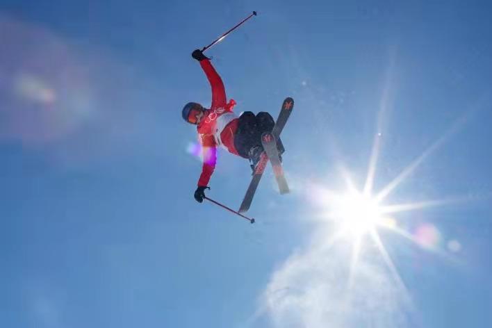 △北京冬奧會期間,藍天白云下,正在參加比賽的運動員。