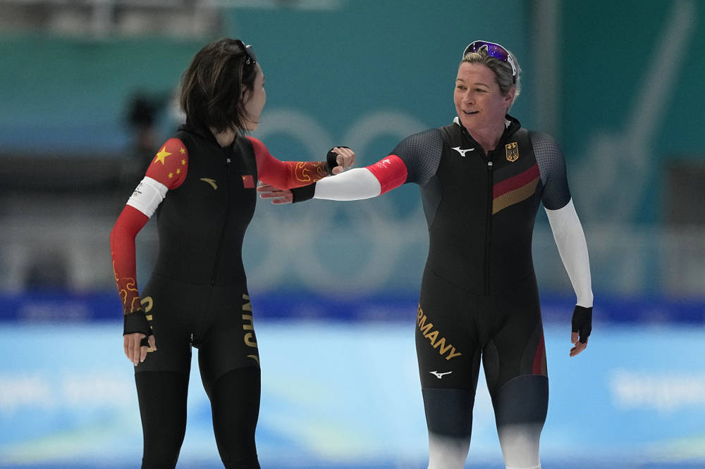 △比賽結束后,中國選手阿合娜爾向德國老將佩希施泰因表達敬意,佩希施泰因微笑著鼓勵阿合娜爾。