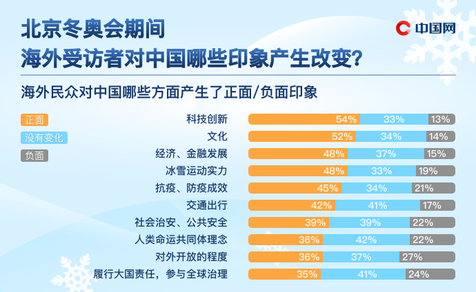 通過關注北京冬奧會,受訪者對中國的科技創新和文化產業產生正向印象變化的比例最高,分別為54%和52%,此外,經濟金融發展、冰雪運動實力、抗疫防疫成效、交通出行等方面發生正向改變的均超過40%。