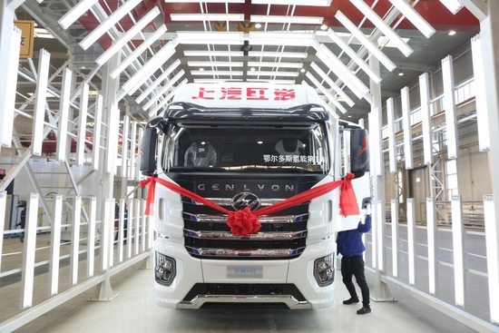 上汽紅巖鄂爾多斯基地天隆工廠生產的首臺氫能重卡。(受訪者供圖)