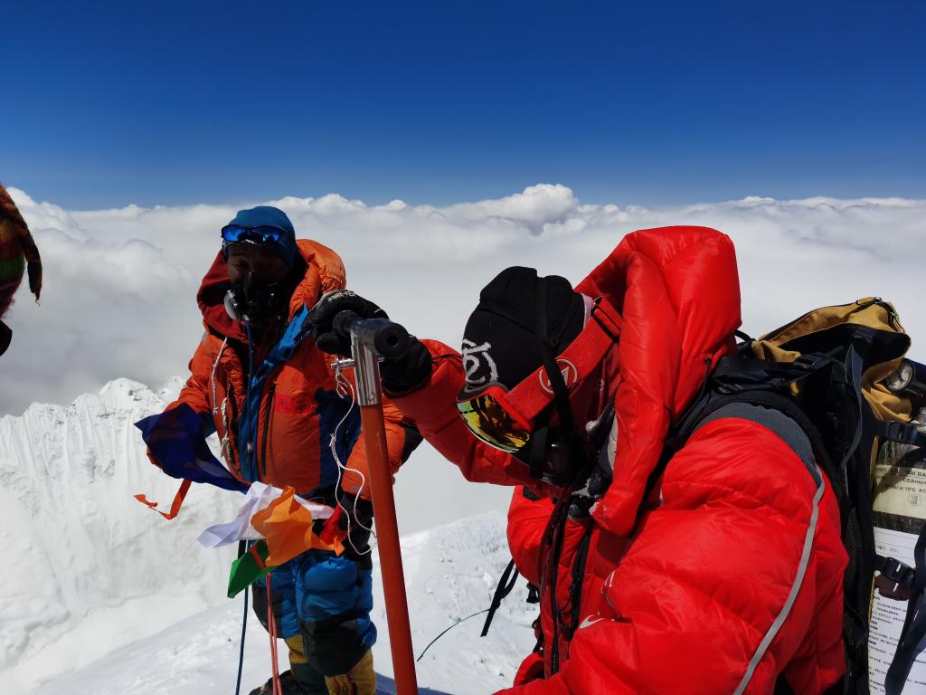 5月4日,科考隊員登上珠穆朗瑪峰峰頂。新華社特約記者 索朗多吉 攝