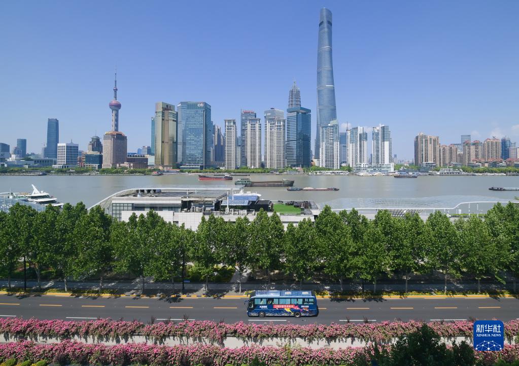 一輛載有援滬醫療隊員的大巴車駛過上海外灘(5月5日攝)。新華社記者 李賀 攝
