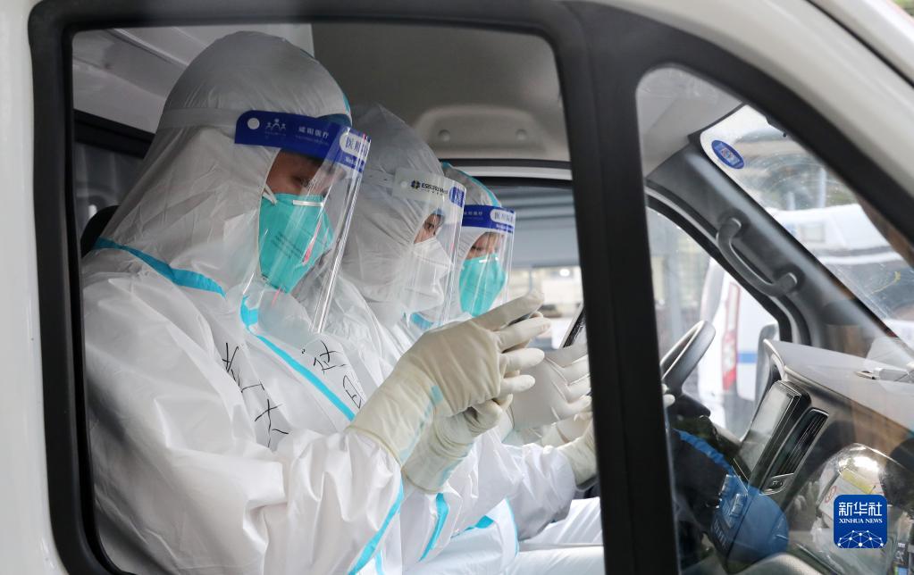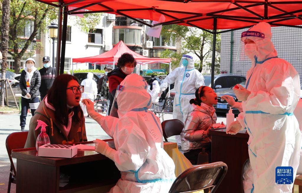 在上海市閔行區七寶鎮一小區內,安徽省援滬醫療隊隊員為居民進行核酸檢測采樣(4月4日攝)。新華社記者 方喆 攝