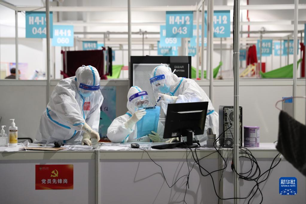 上海世博展覽中心方艙醫院的醫務人員在工作(4月11日攝)。新華社發(劉曉晶 攝)