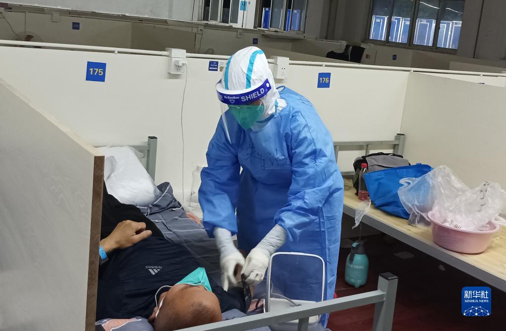 在上海市嘉定區南翔方艙醫院,海南省三亞市婦幼保健院ICU護士朱海波在照顧患者(5月12日攝)。新華社發(受訪者提供)