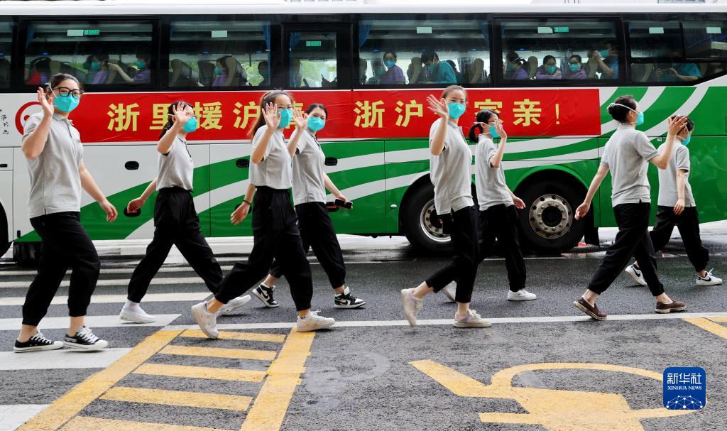 浙江省援滬醫療隊隊員列隊走過停放在位于上海市浦東新區駐地外的大巴旁(5月24日攝)。當日,浙江省援滬醫療隊圓滿完成援滬任務啟程返浙。新華社記者 方喆 攝
