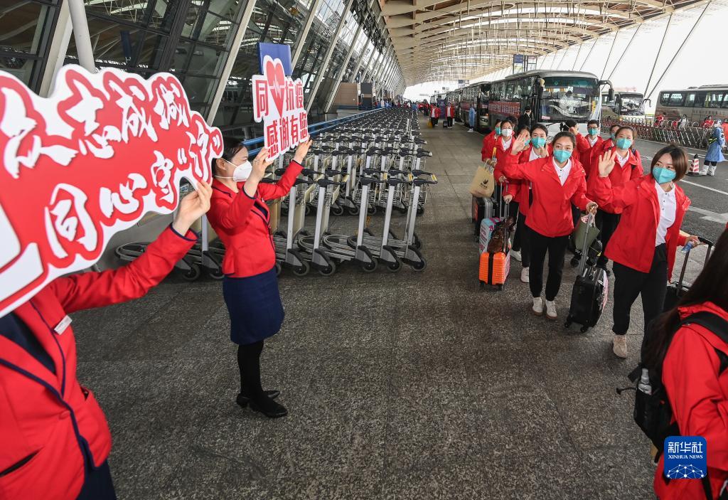 虹橋機場、虹橋高鐵站驟然忙碌起來,全國各地的醫療隊紛紛逆行而至。4月3日,武漢金銀潭醫院援滬醫療隊領隊程芳一下火車,看到很多人前來迎接,不斷說“謝謝”。程芳說:“上海人不用跟武漢人客氣!”