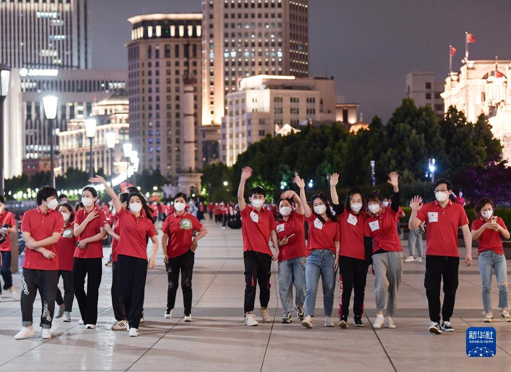 自4月1日起一直封控管理的外灘,特地為陸續撤離的援滬醫療隊開放。告別繁重工作、脫下防護服的隊員們,此刻像孩子一般高興。他們歡歌笑語,擺出各種造型拍照,有的還組隊跳起了流行的毽子舞……