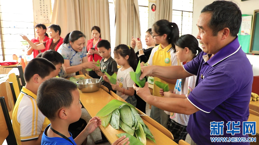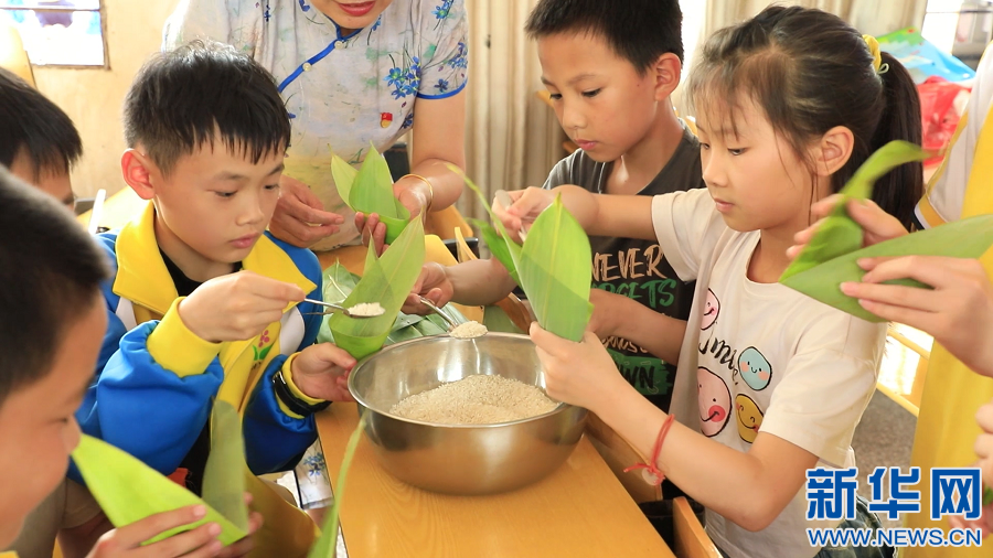 ▲在江西省大余縣南安小學(xué),老師和留守兒童一起包粽子,大家在歡聲笑語中,度過一個(gè)溫暖的“六一”兒童節(jié)。新華網(wǎng)發(fā) 嚴(yán)杰 攝