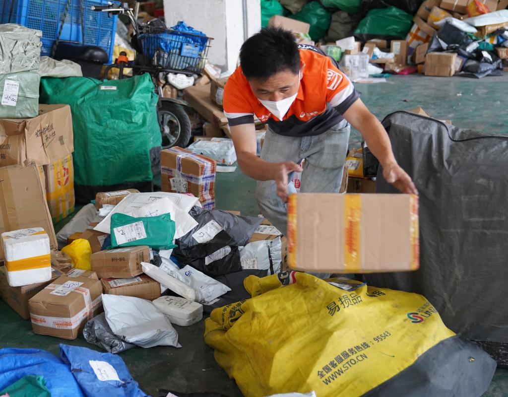 6月8日,申通快遞上海梅隴公司一名快遞員整理即將配送的包裹。新華社記者 楊有宗 攝