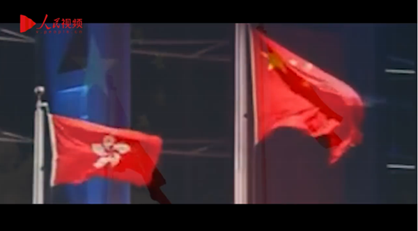 五星紅旗和紫荊花區旗飄揚在碧海藍天之間