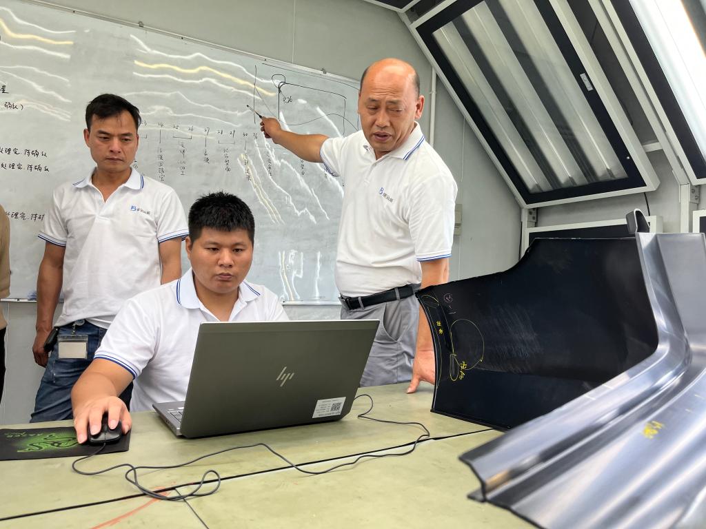 這是古顯善(右一)與技術團隊討論模具制作圖調整方案。新華社記者 趙瑞希攝