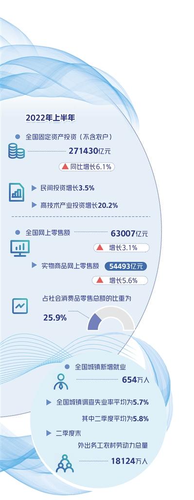 今年上半年,面對異常復(fù)雜困難局面,各地區(qū)各部門高效統(tǒng)籌疫情防控和經(jīng)濟(jì)社會(huì)發(fā)展,國民經(jīng)濟(jì)企穩(wěn)回升。固定資產(chǎn)投資持續(xù)增長,高技術(shù)產(chǎn)業(yè)和社會(huì)領(lǐng)域投資增長較快;市場銷售有所改善,基本生活類商品零售較快增長;就業(yè)形勢好轉(zhuǎn),城鎮(zhèn)調(diào)查失業(yè)率回落;居民收入穩(wěn)定增長,城鄉(xiāng)居民人均收入比值縮小,民生保障有力有效。