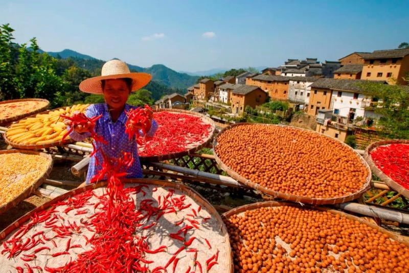 在安徽歙縣陽產村的土樓群,村民們搶抓晴好天氣,晾曬農作物——金黃的玉米、橘黃的南瓜、淡黃的核桃、火紅的辣椒……呈現出一幅幅色彩斑斕的“曬秋圖”。
