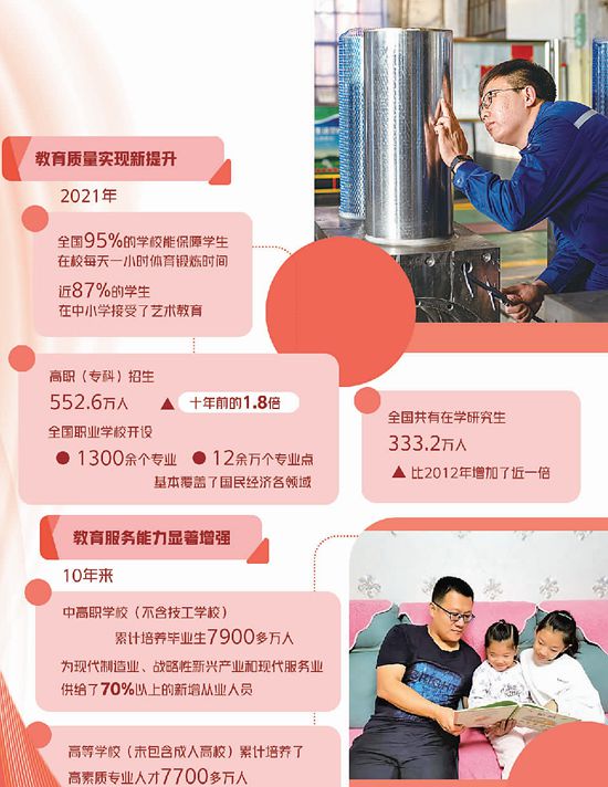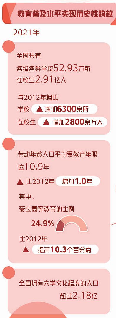 教育是國之大計、黨之大計。黨的十八大以來,在以習近平同志為核心的黨中央堅強領導下,我國教育事業(yè)取得歷史性成就。從教育部公布的一組數(shù)據(jù)可以明顯看出,10年來,我國教育普及水平不斷提高,國民受教育機會進一步擴大,受教育程度也得到了進一步提升。2021年,勞動年齡人口平均受教育年限達10.9年,比2012年增加了1年。
