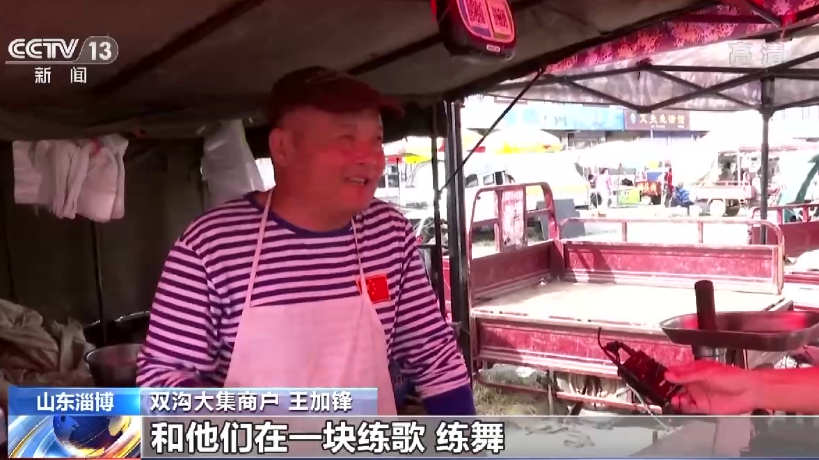 山東淄博雙溝大集商戶 王加鋒:現在為老百姓打造的這個平臺太好了,(有)健身器材、唱歌的會議室。和他們在一塊練歌、練舞,以前唱歌時候(經常)啞喉嚨,不怎么唱就卡住了,啞喉嚨連吃藥片啥的也不大管事,政府派了老師來指點,一指點,發音從哪里發,真的很管用。