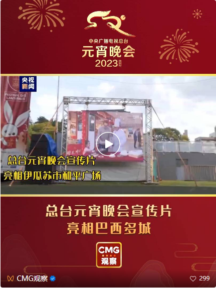 當地時間2月4日,中國駐巴西大使館以及伊瓜蘇市政府等機構聯合舉辦“瀑布城喜迎元宵節”活動。元宵節期間,伊瓜蘇市城市中心的和平廣場上循環播放總臺元宵晚會宣傳片和宣傳海報,傳遞中國節慶文化的獨特魅力。此外,矗立在巴西、阿根廷和巴拉圭三國交界的巴拉那河畔的巨型摩天輪,也于元宵節當晚點亮“中國紅”,為“瀑布城”再添一絲年味兒。