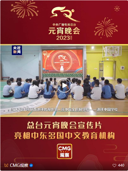 位于阿聯酋迪拜的海外第一所中國全日制學校——迪拜中國學校,以及當地主要中文教育機構也在各自的活動教室循環播放總臺元宵晚會宣傳片,給遠在異國他鄉的中國孩子們送上滿滿的問候和祝福。
