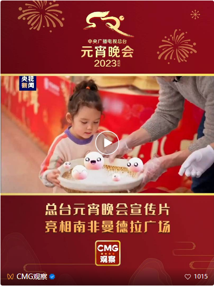 當地時間2月3日,總臺元宵晚會宣傳片在南非第一大城市約翰內斯堡地標建筑曼德拉廣場精彩亮相,這是總臺元宵晚會相關內容首次在南非公共空間播放。