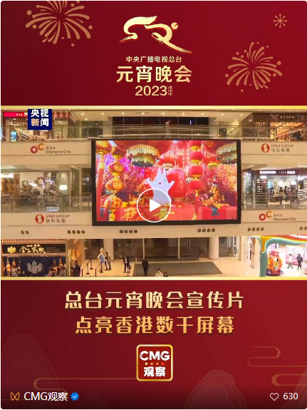 元宵佳節到來之際,總臺元宵晚會宣傳片已提前點亮香港各地數千塊大屏幕,實現了香港大屏全覆蓋,為香港的元宵節添上濃墨重彩的一筆。