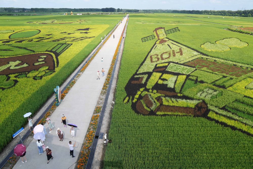 游客在北大荒集團(tuán)閆家崗農(nóng)場有限公司農(nóng)業(yè)現(xiàn)代化示范區(qū)的稻田里游覽(2023年8月10日攝)。新華社記者 王建威 攝