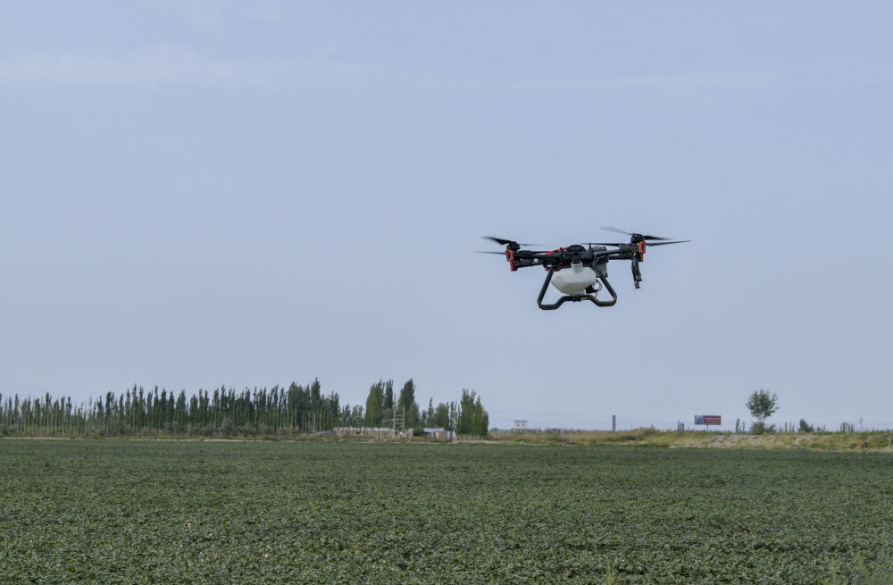 這是2023年9月18日在新疆巴音郭楞蒙古自治州尉犁縣“超級(jí)棉田”拍攝的農(nóng)業(yè)無人機(jī)。新華社記者 郝建偉 攝
