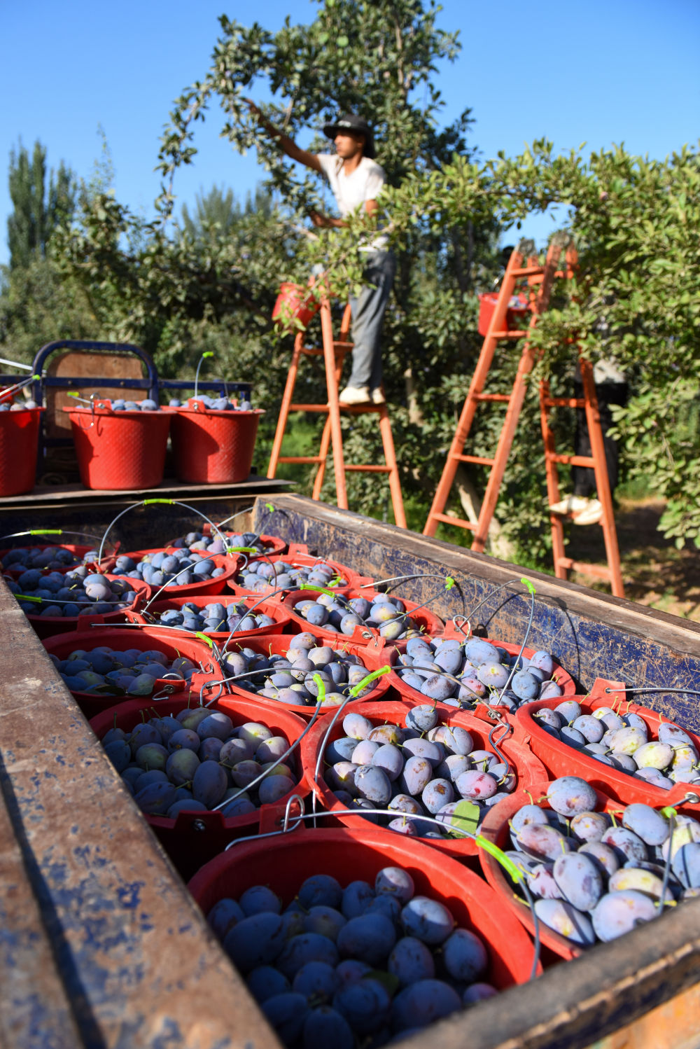 在新疆伽師縣英買里鎮(zhèn)巴格托格拉克村,果農(nóng)在采摘新梅(2023年8月4日攝)。新華社記者 丁磊 攝