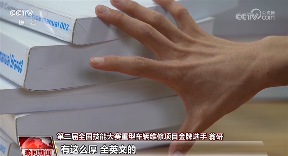 第二屆全國(guó)技能大賽重型車(chē)輛維修項(xiàng)目金牌選手 翁研:其實(shí)這次比賽的車(chē)型在一個(gè)月前才公布,而且全都是全新的車(chē)型,像我們比賽的資料(一個(gè)模塊)有2700多頁(yè),這么厚,全英文的。