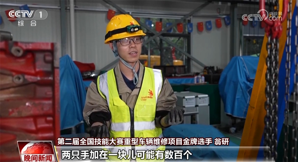 第二屆全國(guó)技能大賽重型車(chē)輛維修項(xiàng)目金牌選手 翁研:我們這個(gè)訓(xùn)練講究的就是熟練度,每天都在練。我記得有一次練得很累,在車(chē)上睡著了,一覺(jué)醒來(lái),手上面都是蚊子包,兩只手加在一塊兒可能有數(shù)百個(gè)。