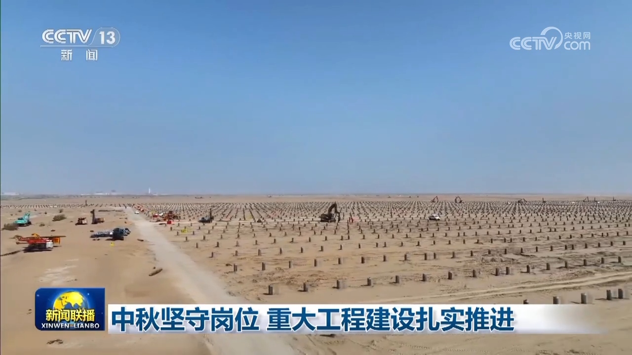 這個中秋假期,在塔克拉瑪干沙漠腹地,上千名施工人員沒有休息,加快建設萬畝光伏治沙項目,他們將用光伏板鋪滿3285個足球場大小的沙丘,年底建成后,將為周邊化工產業群提供每年21億度的清潔電能。