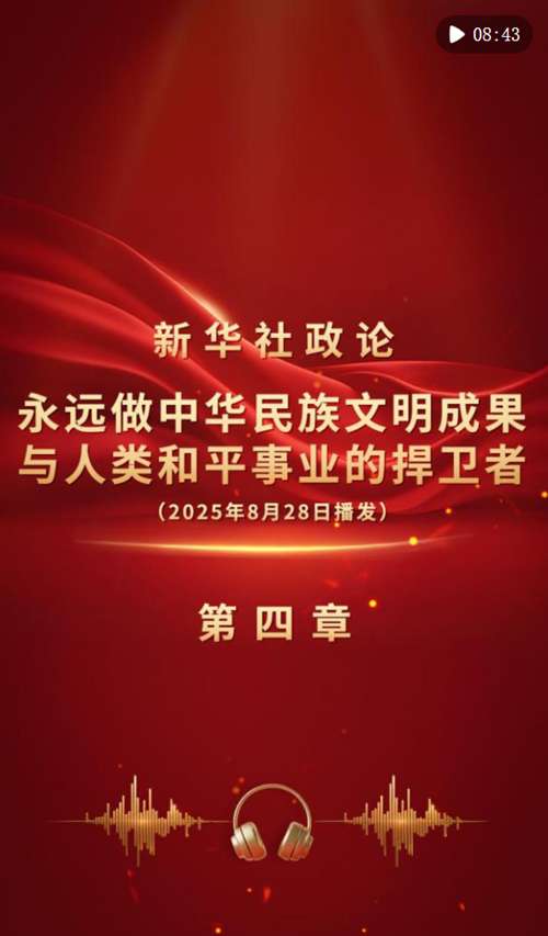 新華社8月28日播發(fā)《新華社政論|永遠(yuǎn)做中華民族文明成果與人類和平事業(yè)的捍衛(wèi)者——寫在中國人民抗日戰(zhàn)爭暨世界反法西斯戰(zhàn)爭勝利80周年之際》。我們邀請誦讀嘉賓張晚意演播“第四章”。