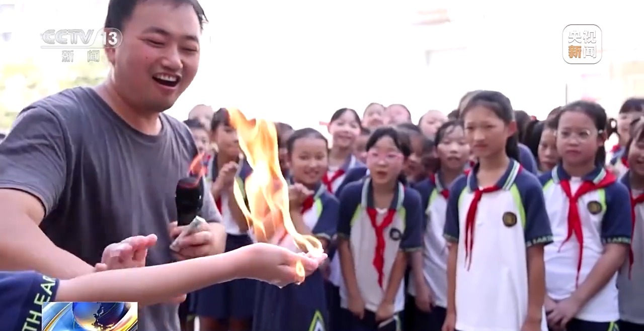 在“科技魔法秀體驗”區,“火焰掌”表演讓同學們親身感受化學反應的奇妙。這個看似“魔法”的現象,實則蘊含著燃燒條件、導熱材料等科學原理。
