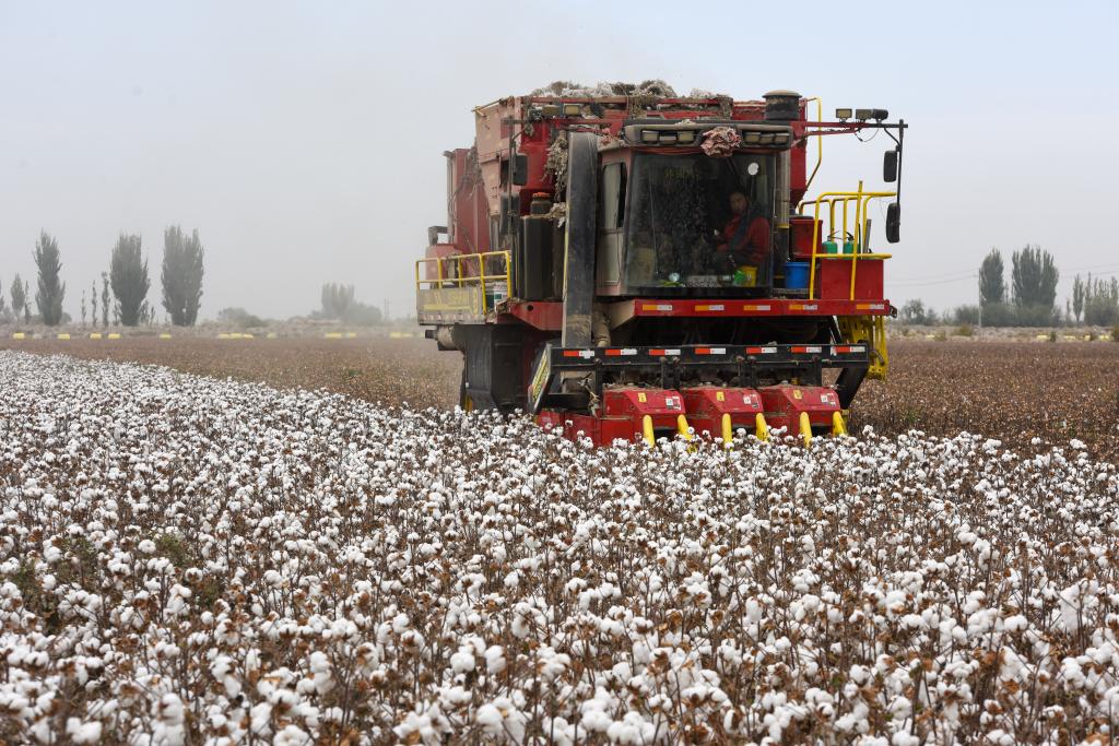 2024年10月24日,在新疆阿瓦提縣,一臺大型采棉機在棉田里作業。新華社記者 高晗 攝