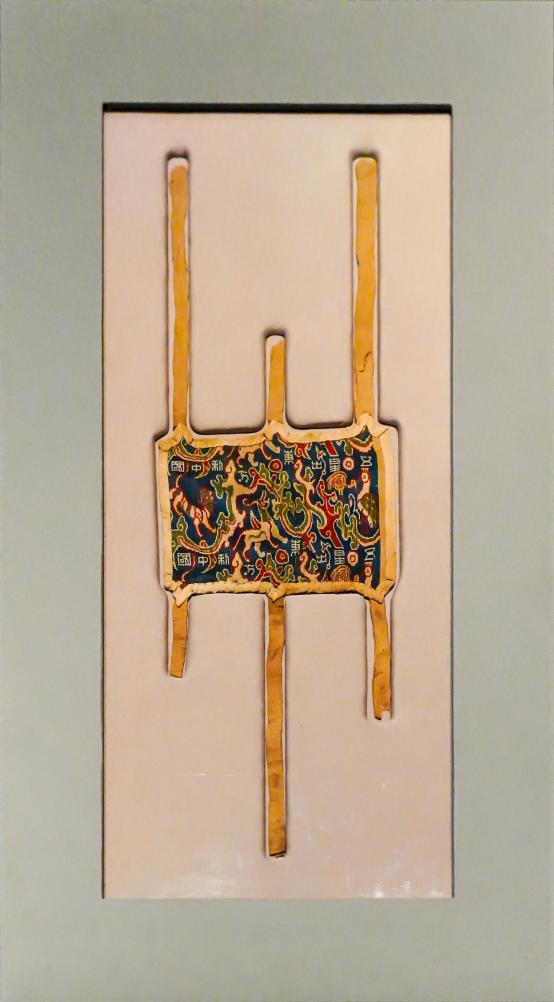 這是2025年5月9日在新疆維吾爾自治區博物館拍攝的漢代“五星出東方利中國”錦護臂。新華社記者 徐宏巖 攝