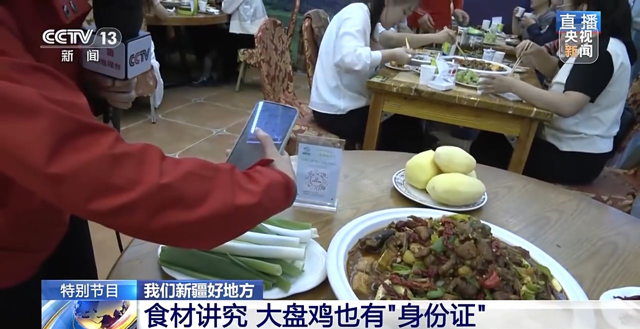 其實,大盤雞里的每一種原料,都是新疆農業發展的縮影。先說這最主要的雞肉,是來自當地標準化散養的土雞,這可不是一般的雞,它讓大盤雞有了“電子身份證”,我們來掃碼看看。