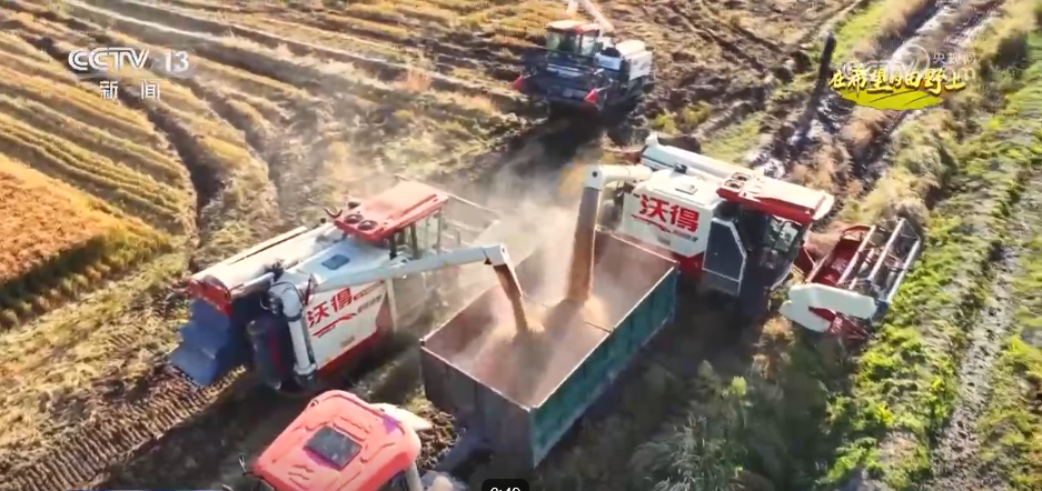 在綏濱縣新富鄉(xiāng)的稻田里,多臺現(xiàn)代化收割機正在緊張作業(yè)。伴隨著機器的轟鳴聲,一排排稻稈被快速卷入收割機,經(jīng)過脫粒、篩選等工序,飽滿的稻谷源源不斷地從出糧口傾瀉而出,裝入一旁等候的運輸車輛中。