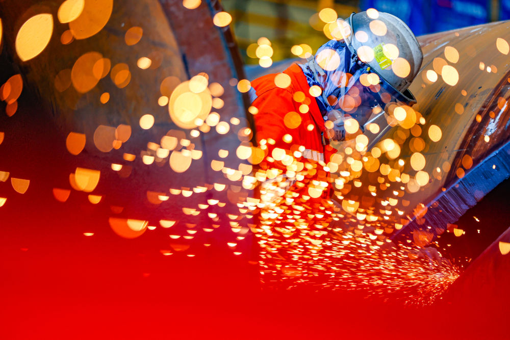 這是10月1日,在天津市濱海新區(qū),渤海油田工人進行打磨作業(yè)。新華社發(fā)(杜鵬輝攝)