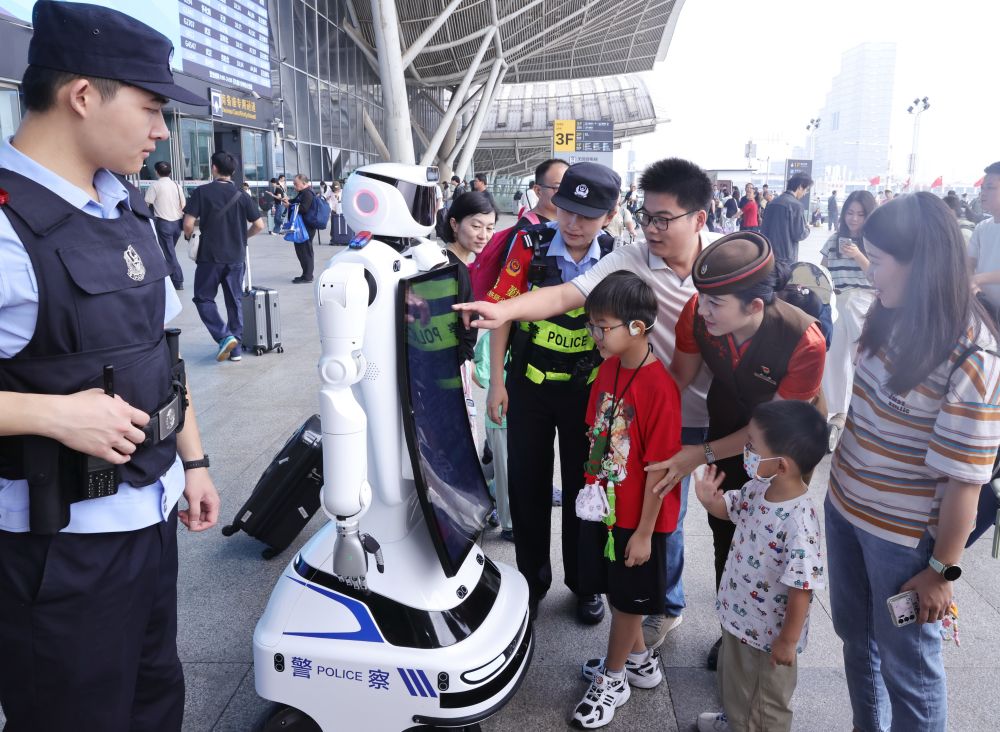 10月1日,在湖北省武漢站,小朋友和機器人互動。新華社發(fā)(趙軍攝)