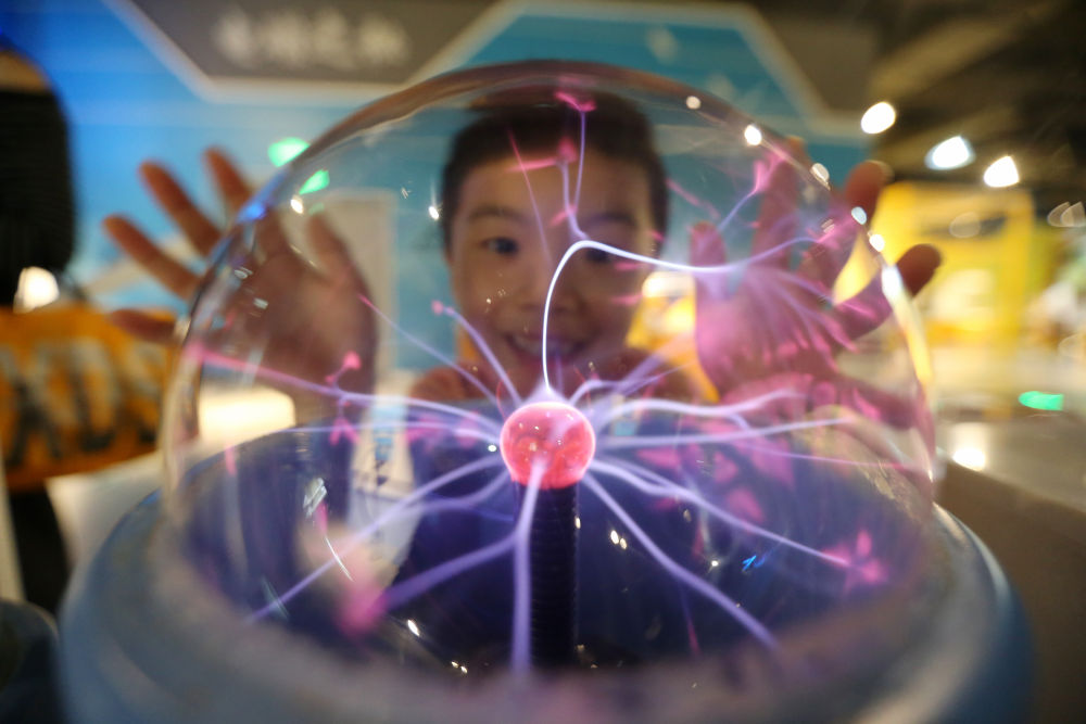 10月3日,小朋友在江蘇揚州科技館體驗“輝光球”。新華社發(fā)(孟德龍攝)