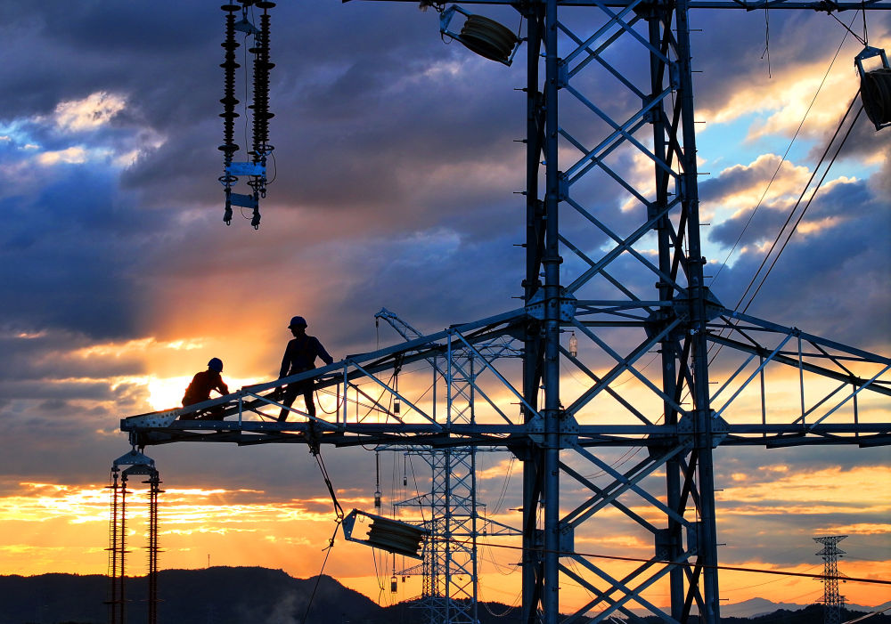 10月6日,在湖南省衡陽市雁峰區(qū)南三環(huán)路上,湖南雁能建設(shè)集團有限公司的施工人員在高塔進行架線施工作業(yè)(無人機照片)。新華社發(fā)(曹正平攝)